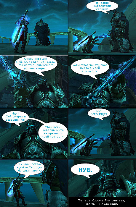 | 101 причина играть в WOW 1. Тебе должны сниться сны про WoW 2. Если тебе не снятся сны про WoW, значит ты недостаточно много играешь. 3. Играй чаще. 4. Еще ЧАЩЕ!!! 5. Ты всегда должен хотеть играть. 6. Секс - жалкое подобие рейда. 7. Оргазм - жалкое подобие левел апа. 8. Быть Локом круто. 9. Если твой перс не Лок, ты должен забыть про предыдущий пункт. 10. У тебя должны быть красные глаза. 11. На игру ты должен тратить больше времени, чем на сон. Как минимум, в два раза. 12. У тебя нет девушки, потому они все слишком тупы, чтобы понять пункт №6. 13. Твои родители втайне помышляют о том, чтобы отправить тебя в клинику для душевнобольных. 14. Ты и сам не против бы туда отправиться, если там есть WoW. 15. У тебя очень много друзей. Целая гилда. Многих ты ни разу не видел. 16. Твои друзья, которые не играют в WoW - не друзья. От силы знакомые. А по сути - потенциальные враги и предатели. 17. Ты не смотришь кино. Мувики про WoW куда интереснее. 18. Когда красивая девушка просит выслать ей твое фото, ты высылаешь фото себя, одетого в Т6 на фоне Элидана. 19. Те, кто не знает, как убить врага за два каста - нубы. 20. У тебя есть подозрения, что вообще все нубы, кроме тебя. 21. Ты никогда не должен говорить, что бегал из города в город пешком. Это участь нубов. 22. Ты бы не прочь переспать с Темной эльфийкой. 23. Дважды. 24. Чем больше у тебя очков с арены, тем ты круче. 25. Ты мечтаешь о том, чтобы играть на сервере, где ты всегда будешь 70 лвл, а те, кто преодолевает порог в 60 лвл, становятся опять 1 лвл. 26. У тебя должен быть Летающий эпик дракон. 27. Пункт №26 не обсуждается. 28. Ты всегда должен говорить, что ты рулишь. 29. Если ты думаешь, что ты не рулишь, см. пункт 3. 30. Тебе хочется, чтобы у тебя была девушка, которая согласна с пунктом 6. 31. В Lineage 2 играют лузеры. 32. Забудь о том, что ты когда-то сам играл в Lineage 2. И не вздумай кому-то об этом говорить. 33. Твоей любимой песней должна быть тема из Шатратта. 34. Ты никогда ни у кого не просил денег, понял? 35. Если кто-то напоминает тебе о том, что ты просил у него денег, поугрожай ему киком и не забудь добавить, что ты рулишь. 36. Мыться чаще, чем раз в неделю глупо. 37. К тому же это неэкономно. 38. Если тебе приснился эротический сон и твоей партнершей в нем не была Темная Эльфийка, смотри п.4. Иначе тебя может настигнуть кара и ты не будешь рулить. 39. Если тебя вдруг одолели в дуэли, скажи: "Я ни причем. Это все лаги." 40. И не забудь напомнить всем, что ты рулишь. 41. Не забывай про пункт 3. 42. Если ты заметил, что у тебя растет живот, не паникуй. С животом проще рулить. И телкам нравятся чуваки с животом. 43. Разденься наголо, напиши на груди " WOW ", возьми пучок сельдерея и иди в ближайший клуб, в котором играет гилда из орды и помочись на клавиатуру их ГилдЛидера. Ты должен сделать это! Ты будешь крут! Сделай это! Пока не сделаешь этого, не читай дальше! 44. Пункт 43 был разводом. А вот гилда орды тебя будет помнить еще долго. 45. Ты ненавидишь читеров. 46. Хотя сам не прочь читануть себе крутую пушку, но ты не умеешь читовать, поэтому пункт 45. 47. Ты выучил английский, переводя описания квестов. 48. Каждый левел ап должен быть настоящим праздником для твоих друзей и родственников. Можно даже выпить пива. И подумать о том, что было бы неплохо трахнуть Темную Эльфийку. 49. Дважды. 50. В университете/на работе/в школе ты думаешь о том, что было бы ниибацо круто, если бы декан/начальник/директор играли в WOW. 51. Вот и половина правил. 52. Если ты узн