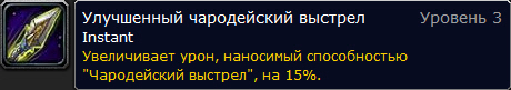 • Улучшенный чародейский выстрел: +15% к урону способностью «Чародейский выстрел». Так как «Верный выстрел» наносит больше урона, чем «Чародейский выстрел» когда у вас более 30% рейтинга пробивания брони, то «Чародейский выстрел» не актуально использовать. Но, не забываем, мы играем на пиратском сервере World of Warcraft, а на нашем сервере рейтинг пробивания брони не работает, следовательно «Чародейский выстрел» логично использовать.