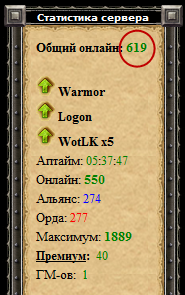 | Относится ко всем сообщениям о снижении on-line: Друзья, некоторым из вас аналитиками никогда не бывать... Проблема не в гильдии. Снижение on-line отмечается на всем сервере. По моему мнению это связано с завершающимся сезоном отпусков, началом учебного года и безнадежным устареванием Wrath of the Lich King 3.3.5.