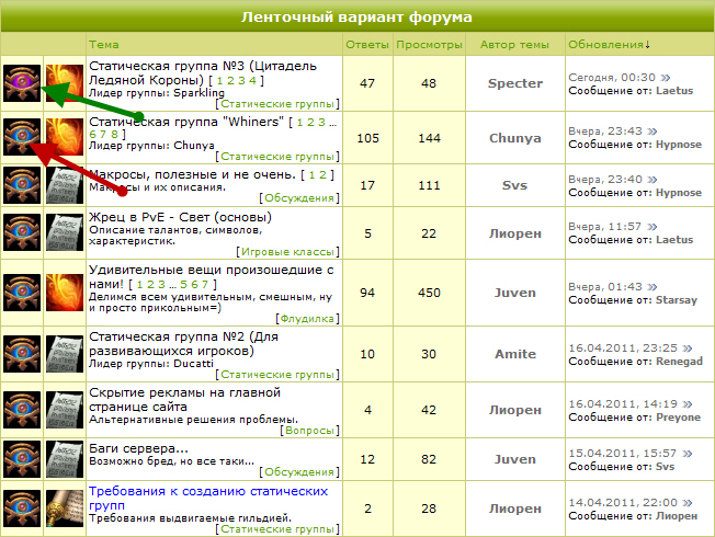 Зеленой стрелкой отмечен значок, показывающий, что в теме добавлены новые сообщения с момента вашего последнего просмотра, красной стрелкой - значок означающий, что новых сообщений в теме нет.