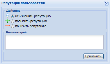 О репутации. Репутация - определяет насколько пользователь полезен для форуме. Если вам понравилось сообщение пользователя, вы можете повысить ему репутацию, если наоборот оно вам не понравилось - понизить её. Для изменения репутации нужно нажать на значок ± в левой части окна сообщения. В результате у вас появится окошко изменения репутации: